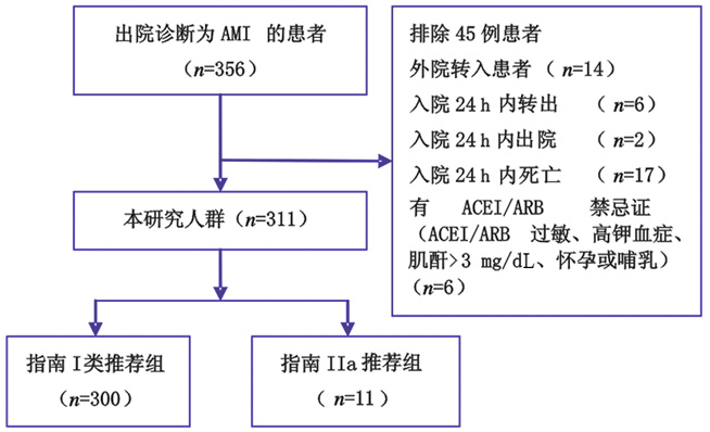 2 结果 2.1 研究对象特征本研究排除外院转入14例、住院24 h内转出6例、出院2例和死亡17例,以及有ACEI/ARB禁忌证6例(包括血钾>5.5 mmol/L 3例、肌酐值>3 mg/dL 3例),共筛选了356例出院诊断为AMI的患者,最终入选311例患者,其中指南Ⅰ类推荐组300例,指南Ⅱa类推荐组11例(图 1)。