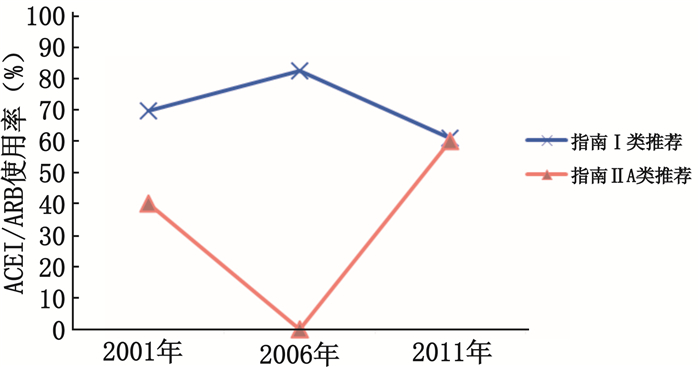 将2001、2006和2011三个特定年份接受住院治疗且出院诊断为AMI的患者作为研究对象。首先,将上述医院中特定年份出院诊断为急性心肌梗死的患者通过病历检索获得。将国际疾病分类临床编码(ICD-9编码410.XX或ICD-10编码I21.XX)作为检索依据,若无ICD编码,则出院诊断的关键词作为检索依据。然后,按照事先设定的比例随机抽取每家医院检索得到的急性心肌梗死住院患者中病例。为确保数据的可靠性,采用统一的数据定义和标准,对抽取的病历进行集中式病历信息提取[15]。为了确保提取信息的准确率>98%,在此过程中,随机提取5%数据进行复核。本研究中以明确的出院诊断的ICD编码作为AMI诊断依据,对于出院诊断不明确的,协调中心的心脏科医生通过查阅住院记录和心电图明确诊断。本研究排除了外院转入和住院时长 < 24 h患者及有ACEI/ARB禁忌证(包括ACEI/ARB过敏、血钾>5.5 mmol/L、肌酐值>3 mg/dL、怀孕或哺乳)的患者以获得适宜服用ACEI/ARB的理想人群。本研究按照中国指南指南Ⅰ类推荐组(包括STEMI和合并心力衰竭、左心室射血分数 < 40%、高血压或糖尿病的NSTEMI)和指南Ⅱa类推荐组(无Ⅰ类推荐指征的NSTEMI)将患者分为两组,以评估住院期间ACEI/ARB使用情况。