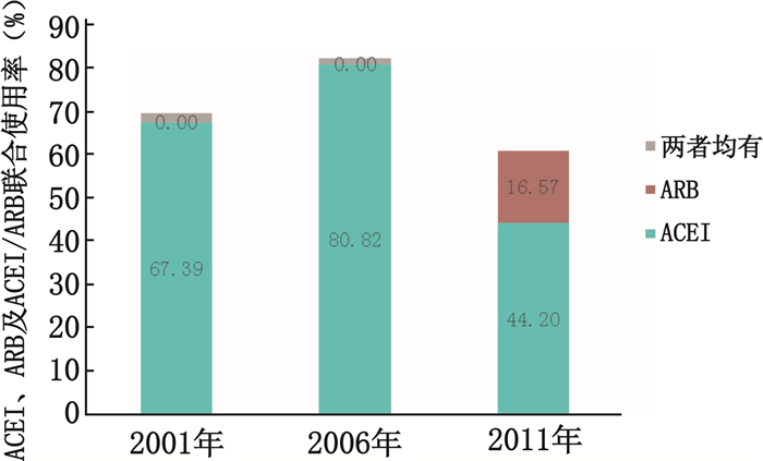 在3个研究年份中,ACEIs使用率均显著高于ARBs(2001年67.39%和0%;2006年80.82%和0%;2011年44.20%和16.57%),ACEIs和ARBs合并使用率较低(2001年2.17%,2006年1.37%和2011年0%),见图 3。