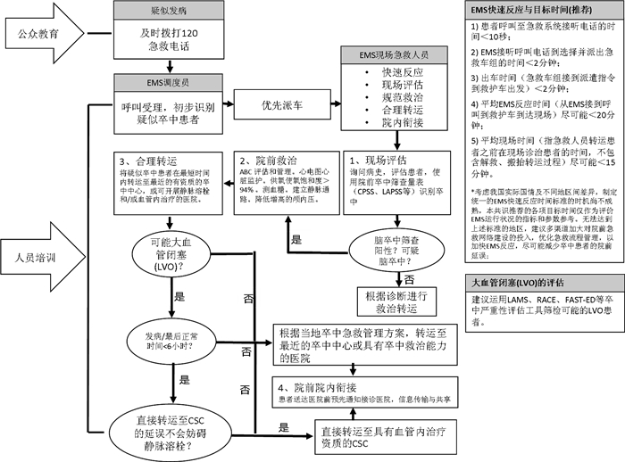 2015年初血管内治疗的数项临床试验显示,对大血管闭塞AIS, 血管内取栓联合静脉溶栓治疗的血管再通率和临床结果均优于单纯静脉溶栓。AHA/ASA随后起草了一个卒中患者院前分类转运流程的共识,有利于早期识别和合理分流转运重症或疑似LVO卒中患者。该流程建议应用应用LAMS、RACE、FAST-ED等LVO及卒中严重性评估量表评估患者情况。对疑似LVO的患者,在发病/最后正常时间小于6 h,并且直接转运至具有血管内治疗能力的综合卒中中心(comprehensive stroke center,CSC)增加时间延误不超过15 min,同时转运至CSC不会妨碍静脉rt-PA溶栓的情况下,直接转运至具有血管内治疗能力的CSC。如果CSC不能满足上述条件,根据当地卒中救治管理计划,就近转运至最近的具有卒中救治能力的医院或其他卒中中心(PSC),包括初级卒中中心(primary stroke center,PSC)。现有证据表明静脉用rt-PA溶栓每延误15 min就会明显影响治疗效果,所以该流程把15 min作为延误的时间截点,随着关于LVO患者早期血管内治疗的获益与延迟静脉溶栓的危害利弊权衡数据资料的积累,流程可能会基于最佳证据及时更新。目前我国尚无数据明确具体可接受的延误时间(指舍去较近的可溶栓医院而改送CSC造成的延误),同时亦缺乏先溶栓再转运至具血管内治疗资质CSC与直接转运至CSC比较的循证医学证据,适用于我国LVO缺血性卒中患者的转运策略有待进一步建立。