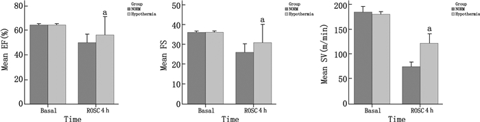 ROSC后4h亚低温治疗组Wistar大鼠的EF值、FS值和SV均显著高于常温治疗组;a表示和常温治疗相比,P<0.05 图 1 ROSC后亚低温治疗改善Wistar大鼠心功能 Figure 1 Mild hypothermia therapy improvesin in Wistar rat cardiac function after ROSC