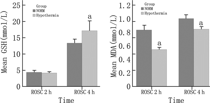 图 2 ROSC后亚低温治疗对心肌内GSH和MDA含量的影响 Figure 2 Effect of mild hypothermia therapy on the GSH and MDA content of myocardial after ROSC