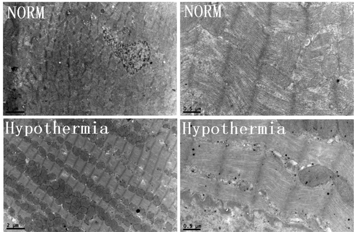 NORM组心肌细胞排列不规则,线粒体聚集,分布紊乱、插入心肌肌节,形态异常,线粒体嵴肿胀;Hypothermia组心肌细胞排列尚规则,线粒体出现聚集现象,主要分布于心肌肌节周围,形态不规则,线粒体嵴轻度肿胀。线粒体损伤评分:0.21±0.04vs. 0.42±0.07,P<0.05。