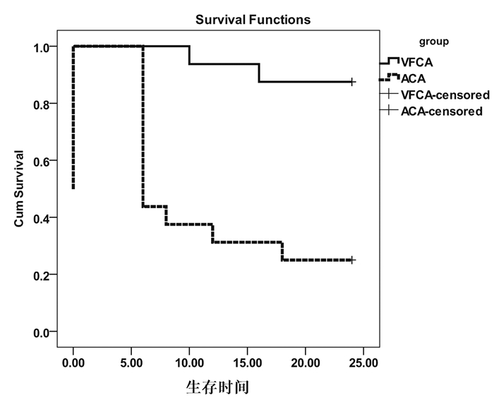 VFCA生存表均值(22.63±0.95) h,95% CI:20.77~ 24.48;ACA生存表均值(8.75±2.54) h,95%CI:3.78~13.72,两组生存函数Log-Rank比较,χ2=14.306,P<0.05。生存函数图见图 1。