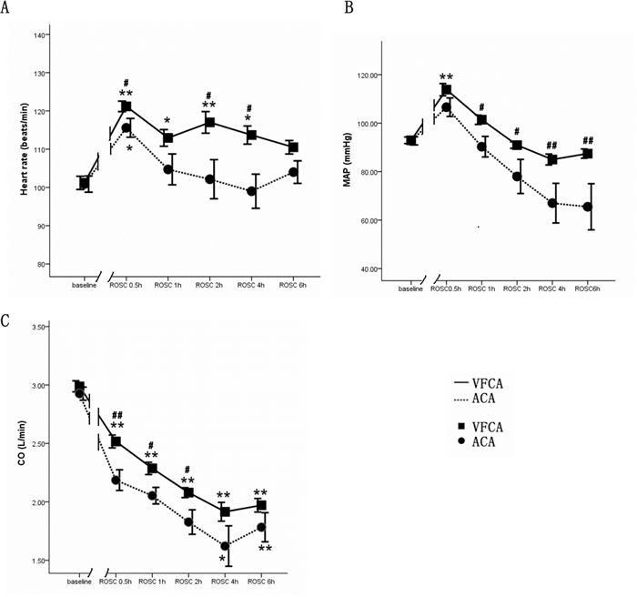 | P<0.05 P<0.01;组间与ACA比较,#P<0.05,##P<0.01。Heart rate:心率,MAP:平均动脉压,CO:心排血量。 图 2 组内与基础状态比较 Figure 2 Comparison of baseline between groups |