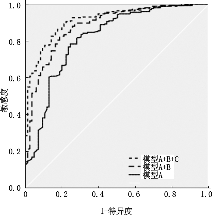 将年龄、GCS评分和瞳孔对光反射定义为模型A,出血量和出血破入脑室定义为模型B,低氧血症、血糖和D-二聚体定义为模型C。采用ROC曲线分析各模型的判别能力。随着纳入危险因素的增多,模型的判别能力随之增强(见表 4和图 1),曲线下面积由0.816到0.913。