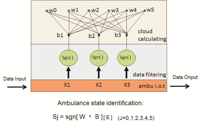 1 空间大数据的获取院前急救涵盖发病现场初级BLS救助以及急救车到达后首次医护接触FMC所提供的高级救助ALS[6]。就急救车而言,在大急诊急救体系内急救车可以理解为急诊部门前出医疗单元,它包含众多变量, 如医护人员状态信息、患者信息、医疗设备信息、车辆环境信息等[7-8],所有这些变量可以归纳为三大变量即人、物、车,分别用X1、X2、X3代表[9-10]。通过车载智能传感器,实现对急救车辆智能化轻改造,可获得变量组数据,经移动互联网(4G)传至云端计算服务器,形成物联网络,云端服务器依据人工智能神经元模型对各个变量分别进行滤波和加权计算,同时将医疗设备数据实时转发至急诊部门,系统架构如图 1所示。