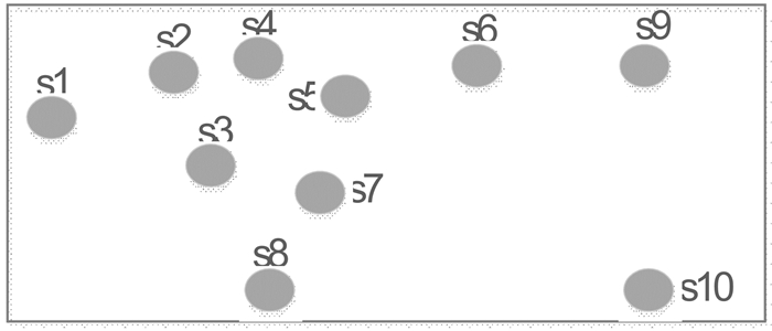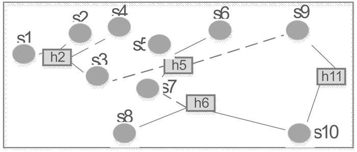 这里我们仅从最优化的角度观察区域急救需求与急救资源的匹配关系。如图 7所示首先将急救热域区块化,以区块重心点为中心即可得如图 8所示院前非均匀需求模型,图中Sj(j=1, 2, …10) 代表急救热域区块中心点。图 9是该区域内所有医院相对于急救热域的空间分布状况,hi(i=1, 2, …, 12) 表示急救区域内分布的医院站点,显示出院前急救需求与供给对应关系。