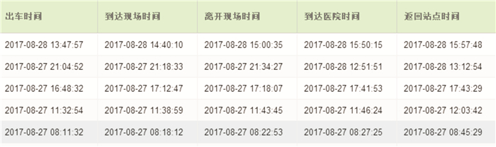在这样的云计算架构体系上,普通急救车辆已成为云支撑的具有较高智能化水平的急救车辆,其中自动实现急救出车时间数据记录如FMC2D时间等是其重要特征,同时实现自动跟踪车辆运行环境状态,实时传输车上病患体征数据,实时传输车上视频影像和问诊语音信息等等,此架构模式也为急救车智能化进一步发展如智能循迹行驶等应用奠定了基础。图 2所示是急救出车救治链时间节点识别记录及出车里程、时长数据的截图示意,这些院前数据为我们管理院前过程,提高急救临床预后效果提供了相关评价依据。