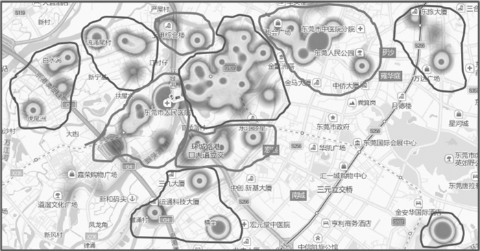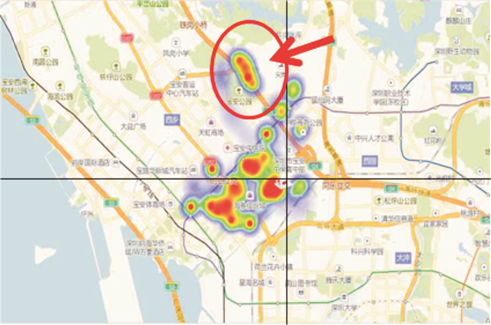 2 院前急救FMC热域色谱图分析基于急救车智能化轻改造并联网云计算应用,通过FMC空间数据分布积累,实现基于电子地理信息系统GIS的FMC热域色谱图[11-12]。图 3所示为深圳宝安区人民医院急诊医学部院前科急救出车数据热域色谱图。