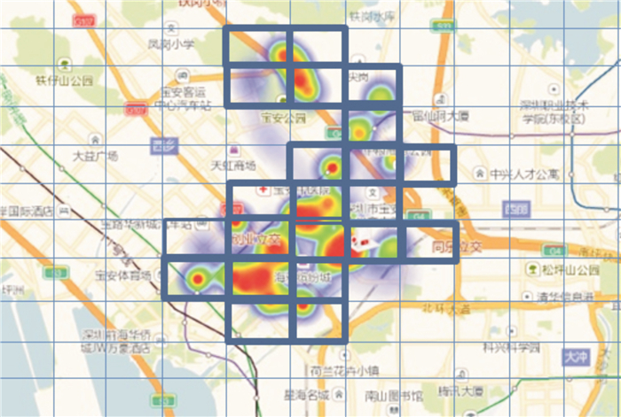 这里我们应用区域内非均匀相对稳定模型来快速解决覆盖问题则能起到立竿见影的效果。以宝安医院院前热域图如上图 5所示为例,如果我们优先对热域网格人员组织培训,则可在相对短时间内达到快速覆盖区域急救需求80%以上区域,见图 5粗线网格域。因此,这样基于空间大数据决策的工作方法其工作效率将大大提高,事半功倍!