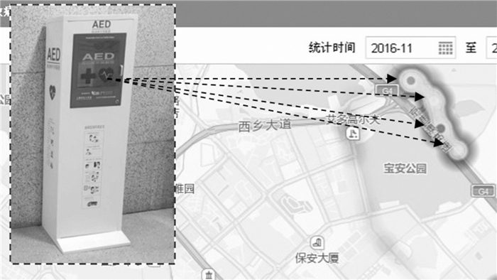 在图 3中我们还发现一个有趣现象,如图 3中箭头所指红圈区域是针对宝安公园发生的急救FMC现场点,它们有序地分布在公园门口区域,这一现象提醒着我们公共场合急救资源投放如AED设备的设置应当尽可能重点布置于类似大门口等特别显著的公共区域如图 6所示,而不应均匀分布于公共场合内,符合万立东等[15]的建议。