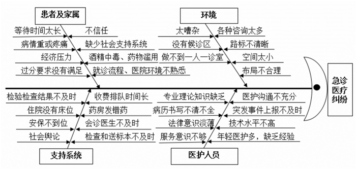1.3 评估急诊医疗纠纷发生的原因集中科内中级及以上职称医护人员分析讨论,查阅相关文献[5-8],采用头脑风暴法,列出急诊医疗纠纷发生的高危因素,采用鱼骨图分析法,从医护人员、患者及家属、工作环境、支持系统4个方面分析急诊医疗纠纷发生的原因,寻找可控性的根本原因。见图 1。