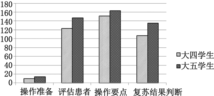 CPR考核分为“操作准备、评估患者、操作要点、CPR结果判断”等四个部分。两组学生四个部分的扣分情况比较、以及男生和女生之间扣分情况的比较,差异均无统计学意义。但两年级组内中“操作要点”部分扣分人次均明显高于其他三个部分,差异均有统计学意义(P < 0.05);而两组中“操作准备”部分扣分人次均明显低于其他三个部分,差异也均有统计学意义(P < 0.05),见图 1
