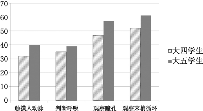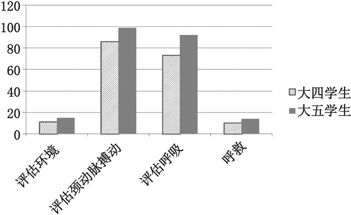 与“触摸大动脉”比,P < 0.05;与“判断呼吸”比,P < 0.05 图 4 大四、大五两组学生考核CPR分解部分中“复苏结果”扣分情况