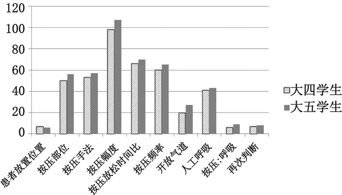 “操作要点”部分包括:“患者放置位置,按压部位,按压手法,按压幅度,按压放松时间比,按压频率,开放气道,人工呼吸,按压与呼吸比,以及按压后再次判断”10个部分,每个部分中大四、大五两组学生扣分人次的构成比相比较差异无统计学意义。