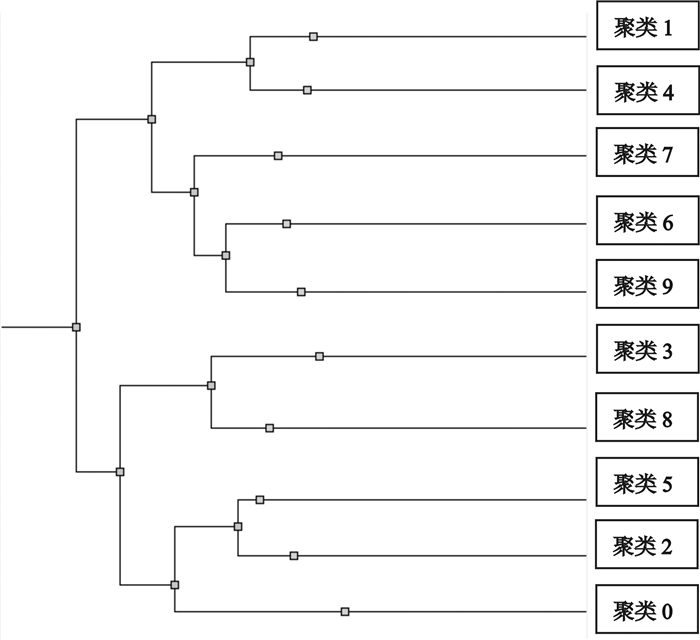 1.3 聚类分析以及可视化展示使用上述生成的词篇矩阵,导入gcluto 1.0软件(明尼苏达大学, http://glaros.dtc.umn.edu/gkhome/cluto/gcluto/download),采用重复二分法(Repeated Bisection)进行聚类分析,采用cosine函数进行相似性计算,聚类标准函数为I 2。同时生成主题词聚类树状图以及可视化高斯曲线拟合形成的山峰图。