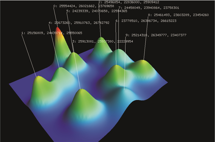 每个山峰代表了一个聚类,山峰的体积、高度、位置和颜色都反映出其代表类群的相关信息。山丘的高度与类内相似性成比例,体积与类群包含的文献数量成比例。山丘的颜色与类内标准差成比例。红色代表低标准差,蓝色代表高标准差。只有峰顶的颜色是有意义的。其他区域所产生的颜色混合为平滑过渡,见图 2。