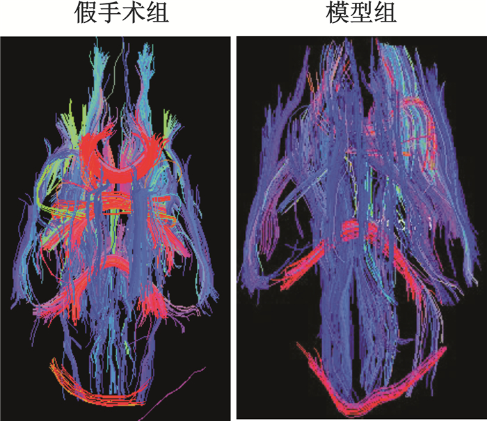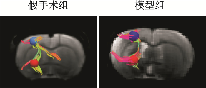 缺血-再灌注损伤14 d后各组大鼠进行DTI成像,如图 1所示,假手术组大鼠神经纤维分布完整,可见明显的胼胝体纤维,左右神经纤维分布均匀、对称。模型组大鼠左侧神经纤维明显缺失,左右横向神经纤维明显减少。进一步缺血侧感觉运动区-纹状体神经纤维连接分析显示(图 2),假手术组大鼠可见清晰的感觉运动区到纹状体的神经纤维连接,而缺血-再灌注损伤后,模型组大鼠神经纤维连接的数量明显减少。