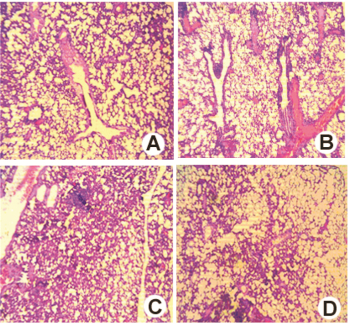 选取右侧肺脏组织块,于10%甲醛溶液中固定24 h,经酒精梯度脱水,常规石蜡包埋,4 μm厚度切片,贴片固定。将贴片蒸馏水中浸泡1 min,苏木精染色5 min,水洗5 s,然后伊红染色30 s,使用增色液冲洗2次,封片留观察。