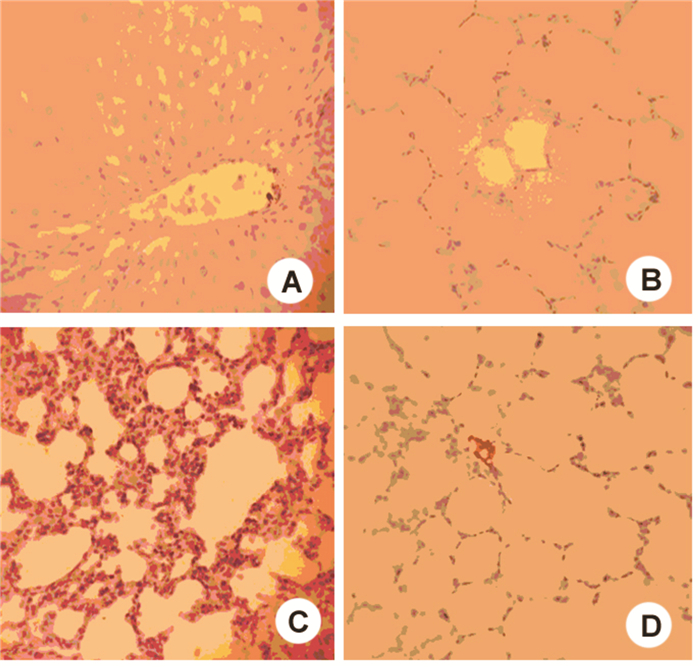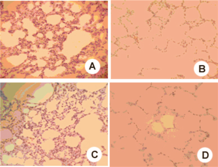 A:对照组12 h;B:休克复苏组12 h;C:对照组24 h;D:休克复苏组24 h 图 1 大鼠肺脏HE染色图像(×200) Figure 1 Hislogogical observation of lung tissue with HE staining(×200)