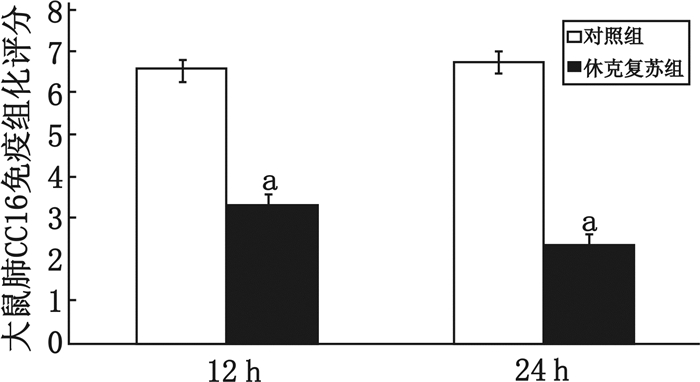休克复苏组与对照组比较,aP < 0.05 图 3 各组大鼠肺脏克拉拉细胞蛋白(CC16)免疫组织化学评分 Figure 3 Immunohistochemical score for CC16 in each group