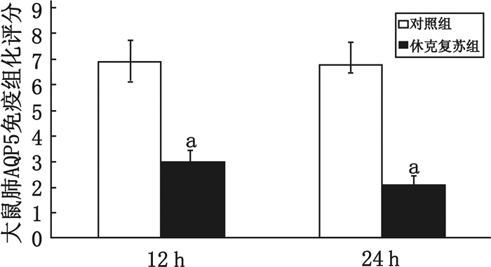 休克复苏组与对照组比较,aP < 0.05 图 5 各组大鼠肺脏AQP5免疫组织化学评分 Figure 5 Immunohistochemical score for AQP5 in each group