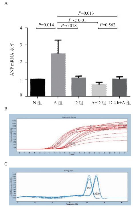 N组为对照组; A组为血管紧张素Ⅱ组; D组为5-氮杂胞苷组; A+D组为血管紧张素Ⅱ+5-氮杂胞苷组; D4 h+A组为5-氮杂胞苷预处理4 h组; A:各组ANP mRNA表达情况; B:前者为ANP扩增曲线,后者为GAPDH扩增曲线; C:前者为ANP扩增产物溶解曲线,后者为GAPDH扩增产物溶解曲线,两者均呈单一溶解峰,扩增产物具有特异性 图 1 ANP mRNA荧光定量PCR结果 Figure 1 Real-time PCR quantitative detection of ANP mRNA