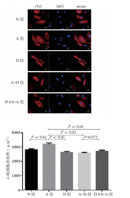 N组为对照组; A组为血管紧张素Ⅱ组; D组为5-氮杂胞苷组; A+D组为血管紧张素Ⅱ+5-氮杂胞苷组; D4 h+A组为5-氮杂胞苷预处理4 h组 图 2 心肌细胞免疫荧光及表面积统计分析 Figure 2 Immunofluorescence of cardiomyocytes and surface area analysis