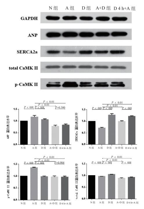 N组为对照组; A组为血管紧张素Ⅱ组; D组为5-氮杂胞苷组; A+D组为血管紧张素Ⅱ+5-氮杂胞苷组; D4 h+A组为5-氮杂胞苷预处理4 h组 图 3 ANP、SERCA2a、total CaMK Ⅱ、p-CaMK Ⅱ蛋白表达情况及条带灰度分析 Figure 3 Western Blot quantification of ANP, SERCA2a, total CaMK Ⅱ, p-CaMK Ⅱ protein expression