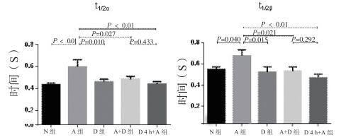 N组为对照组; A组为血管紧张素Ⅱ组; D组为5-氮杂胞苷组; A+D组为血管紧张素Ⅱ+5-氮杂胞苷组; D4 h+A组为5-氮杂胞苷预处理4 h组; t1/2α为胞内钙离子浓度上升到一半峰值时所需要的时间,t1/2β为胞内钙离子浓度下降到一半峰值时所需要的时间 图 4 Fluo-3标记细胞内钙上升与下降时间变化情况 Figure 4 The rising and falling time of the calcium concentration labeling by Fluo-3