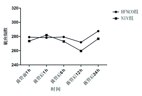 两组患者治疗后1~24 h内,HFNCO在改善PaO2、降低PaCO2方面作用较NPV组效果效果略高,但差异无统计学意义(P>0.05);两组患者动脉血pH、乳酸等差异无统计学意义(P>0.05)。HFNCO在改善氧合指数方面作用较NPV组效果更好(P<0. 05),其中HFNCO组拔管后24 h氧合指数改善最为明显,NIV组于拔管后1 h氧合指数改善最为明显(图 2); 两组患者拔管前HR、RR均处于偏高或正常偏高水平,HFNCO组较NPV组降低HR、RR效果更为显著。时间因素在降低心率方面差异具有统计学意义(P<0.01),HFNCO组患者心率随着时间的进展呈平稳下降趋势,NIV组患者心率在拔管后1 h出现小幅度上升后逐渐降低(P<0.05)(图 3);HFNCO组在降低呼吸频率方面作用较无创更显著(均P<0.01),时间因素在降低呼吸频率方面也有统计学意义(P<0.01),患者呼吸频率随着时间的进展呈平稳下降趋势,其中经鼻组患者在拔管后24 h,呼吸频率降低最为显著(图 4)(表 1)。