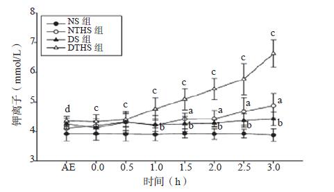 与NS组比较,aP < 0.05;与DTHS组比较,bP < 0.05;与NTHS组比较,cP < 0.05;干热环境组与常温环境组暴露3 h比较,dP < 0.05 图 2 各组血清钾离子浓度变化趋势图 Figure 2 The trend chart of serumpotassium level in each group