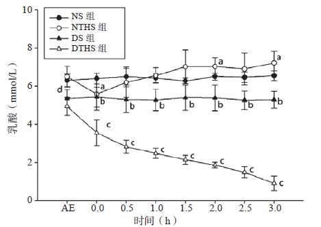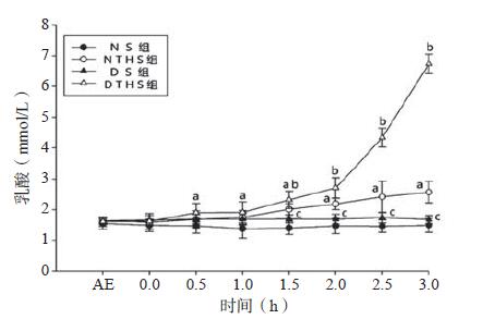 与NS组比较,aP < 0.05;与DTHS组比较,bP < 0.05;与NTHS组比较,cP < 0.05 图 3 各组血清乳酸浓度变化趋势图 Figure 3 The trend chart of serum lactate in each group