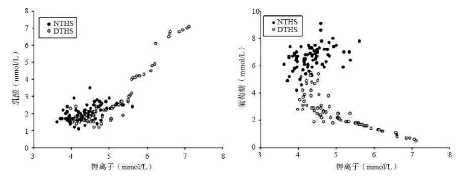 血清葡萄糖浓度暴露后干热环境组血清葡萄糖(Glu)浓度显著低于常温组(F=27.275,P < 0.01)。NTHS组自创伤失血性休克后在NS组上下波动,自4 h后呈快速进行性下降,3h内仅0 h、2 h和3 h与NS组差异有统计学意义(P < 0.05)。DTHS组自开始建立模型开始即呈进行性快速下降,与DS组自休克0 h开始差异有统计学意义(t=6.23,P < 0.05),与NTHS组自休克后即差异有统计学意义,持续至DTHS组动物死亡(图 5)。血清K+浓度与DTHS组血清Glu浓度呈负相关,与NTHS组呈正相关,相关系数分别是rDHTS=-0.804,rNTHS= 0.420(P < 0.01),见图 4