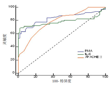 选择PMA、IL-6和APACHE Ⅱ为检验变量, 以ARDS为状态变量拟合ROC曲线。结果显示, 以PMA为检验变量时, AUC=0.833, 有显著的诊断价值(P < 0.01), PMA预测ARDS的最佳临界值为8.8%, 灵敏度为71%, 特异度为82%;以IL-6为检验变量时, AUC=0.785, 有显著的诊断价值(P < 0.01), IL-6预测ARDS最佳临界值为22.2, 灵敏度为67.7%, 特异度为98.4%;以APACHE Ⅱ为检验变量时, AUC=0.784, 有显著的诊断价值(P < 0.01), APACHE Ⅱ预测ARDS的最佳临界值为18.0, 灵敏度为66.1%, 特异度为75.4%。PMA预测ARDS发生的准确性较IL-6、APACHE Ⅱ评分高, 见表 4~5, 图 2。