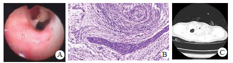 | 图 1 A:病例1纤支镜下见气管黏膜红肿, 并可见黏液条索状物质; B:病理结果(支气管)小片炎性坏死组织(HE, 200×); C:胸部CT提示气管上段线样稍高密度影 |