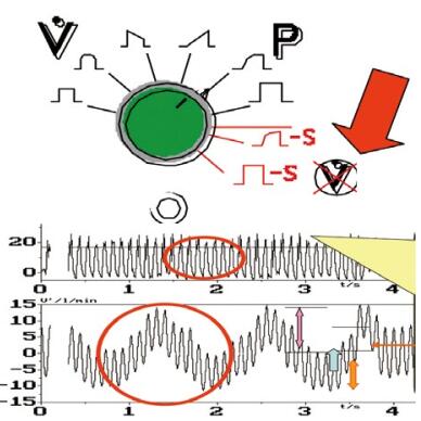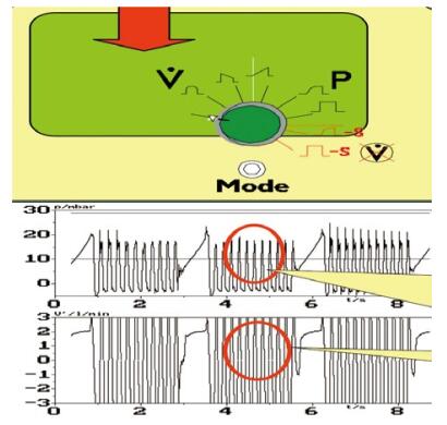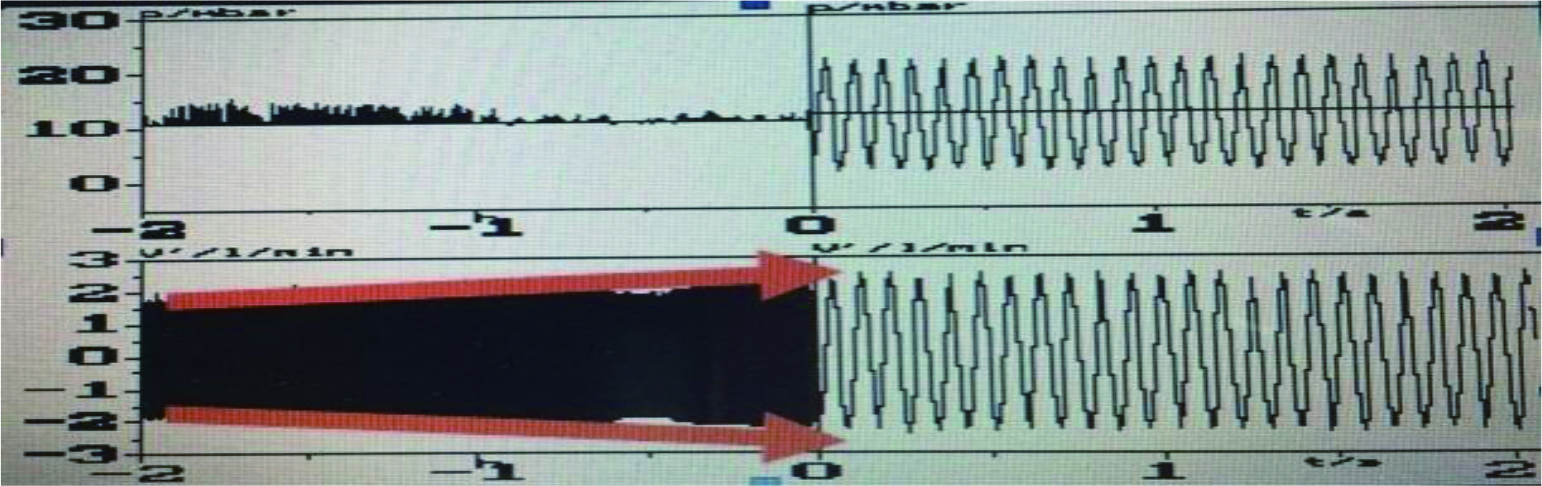 高频与容量控制模式组合的波形如图 1,上半幅为高频压力(时间)曲线,下半幅为流速(时间)曲线。特点是吸气相仍为常频,只在呼气相为高频。优点是因为呼吸性酸中毒患儿的主要矛盾是CO2潴留,呼气相为高频可主动将肺泡CO2排出,但其平均压MAP却比全高频要低10%~20%,故该模式又称高频的低容量策略。临床上多用于治疗气漏、间质性肺气肿、支气管病变、胸膜漏气等以呼气不畅,CO2潴留为主要矛盾的肺不均衡性病变患儿。