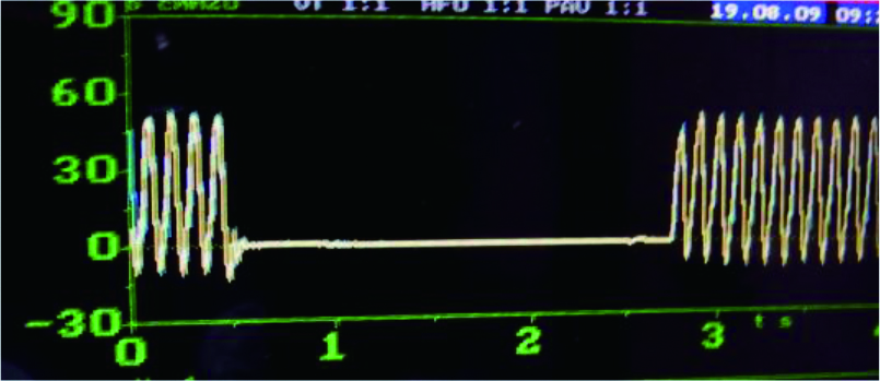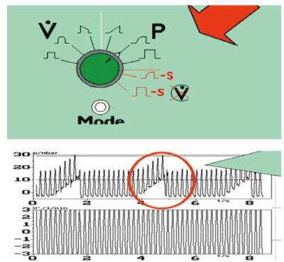 呼吸机都配备有压力安全阀,常频通气时(图 9左侧)是处于开放状态,(Normal Position)一旦压力超过限压,机器立刻自动打开安全阀,超限部分的压力向大气释放,同时发出呜呜的报警声响,震荡立刻中止,屏幕上的压力曲线中断,如图 10所示。高频震荡的振幅,貌似很高,但高频工作原理与常频不同,压力通过气道、支气管等后大量被衰减,到达远端肺泡的真实压力仅是气管插管处的1/20~1/50,因此大可不必为屏幕上高振幅的假象所迷惑,高频压力几乎没有造成肺损伤的可能[3]。仅是放在插管外口端的压力传感器在接受貌似高压的信息,被迫打开安全阀,释放伪高压以求安全。于是出现了高频压力波形中断的假象,同时还可以听到“呲呲”的放气声,等到伪高压释放后又恢复到安全阀允许值的范围内,开始重新震荡,如此循环反复[4]。只要在使用高频时用塞子把安全阀放气阀塞住就可以(图 9右侧)。注意在做完高频震荡通气后,把安全阀的塞子拉开,恢复到原来的常开状态。防止再次上机如用常频可能带来超压不释放的潜在危险。