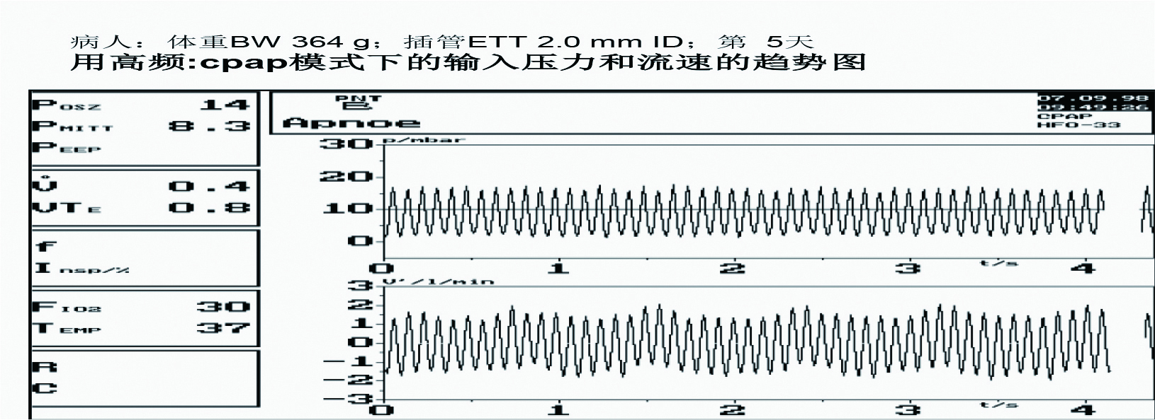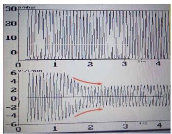 图 5所示:机器的输入压力控制在30 mbar不变,说明机器本身应没问题。流速波形却呈对称状下降,原因可能为:新生儿呼吸机传感器都安装在近患儿端的插管处,如插管偏细或松动,部分气体从插管的缝隙边泄漏,没有流经传感器,致流速变小;小气道病变趋坏、气道痉挛、或插管被痰堵塞致阻力变大;肺顺应性变差等原因,都可导致输入输出的流速下降。