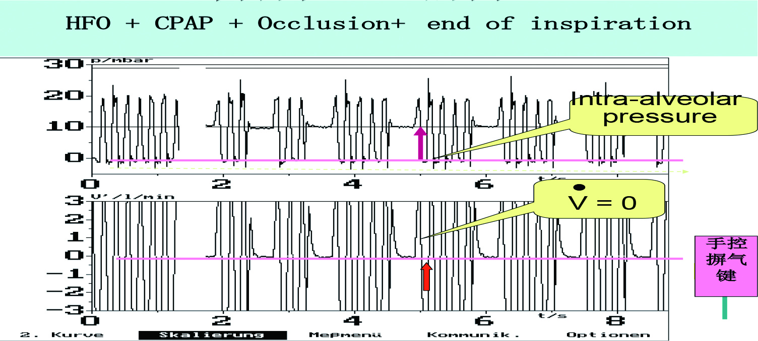 高频通气的主要用途是用来主动排除CO2。可以利用高频波形来评估CO2的清除率。内源性AUTO-PEEP与CO2排除之间有着直接的相应关系。可以如图 8通过监测内源性PEEP来判断CO2的潴留情况。具体操作:在压力呼气相时,临时按住高频机器面板上的摒气键,将高频震荡通气波形临时冻结3~5 s,再通过标尺测量总压力波形中的呼气末压力离横坐标的高度,就是总的呼气末压力(PEEP totle),减去预设置的PEEP值,就是内源性PEEP值(AUTOPEEP),即PEEPtotle=AUTOPEEP+PEEP,内源性PEEP可以评估CO2潴留情况。