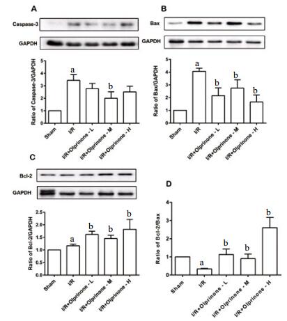 用westerblot免疫印迹法分析奥普力农对凋亡蛋白表达的影响,结果显示与sham组相比,I/R组显著增加了Caspase-3表达,差异有统计学意义(3.44±0.47,t=5.58, P < 0.01);olprinone-M组Caspase-3表达为(2.00±0.52,t=2.06,P < 0.05), 低于I/R组;olprinone-L组、olprinone-H组表达为(2.77±0.42,t=1.06,P > 0.05;2.51±0.47,t=1.40,P > 0.05), 差异无统计学意义。与sham组相比,I/R组能使Bax表达增加(4.06±0.25,t=14.35, P < 0.01);olprinone-L组、olprinone-M组、olprinone-H组下调Bax表达为(2.16±0.61,t=2.903, P < 0.01;2.74±0.66,t=2.01, P < 0.05;1.65±0.55,t=4.26, P < 0.01)。与sham组相比, I/R组上调Bcl-2表达(1.17±0.06,t=2.92, P < 0.01)olprinone-L组、olprinone-M组、olprinone-H组能不同程度的促进Bcl-2表达(1.62±0.13,t=3.15, P < 0.01;1.46±0.13,t=1.99, P < 0.05;1.82±0.39,t=1.97, P < 0.05)。由Bcl-2与Bax蛋白表达计算得出Bcl-2/Bax比值,与sham组相比,I/R组Bcl-2/Bax比值降低(0.33±0.03, t=21.5,P < 0.01);olprinone-L组、olprinone-M组、olprinone-H组预处理使其不同程度升高,差异有统计学意义(1.13±0.31,t=2.78, P < 0.01;1.46±0.25,t=2.24, P < 0.05;2.60±0.57,t=4.80,P < 0.01)。