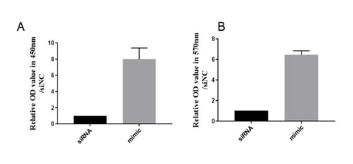 MMT法检测miR-132-3p mimic和siRNA转染的内皮祖细胞在低氧条件下的增殖情况。结果显示在低氧条件下,miR-132-3p mimic(实验)组细胞增殖是siRNA(对照)组的(7.79±1.37)倍(n=5,P < 0.01),见图 4A。另外,本研究分别将miR-132-3p mimic和siRNA转染的内皮祖细胞在低氧条件下培养24 h后,CCK-8法检测细胞的增殖情况。结果表明miR-132-3p mimic转染的内皮祖细胞在450 nm处的吸光度值为siRNA组的(6.46±0.38)倍(n=5,P < 0.01),即低氧条件下,异源性过表达miR-132-3p可显著促进内皮祖细胞的增殖。见图 4B