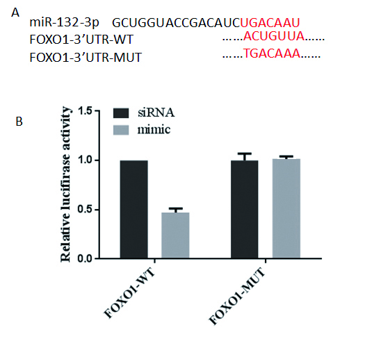 A. miR-132-3p与FOXO1 mRNA 3'UTR的核苷酸特异性序列; B.双萤光素酶报告基因检测结果 图 5 miRNA-132-3p直接靶向FOXO1 Figure 5 miRNA-132-3p directly targets FOXO1