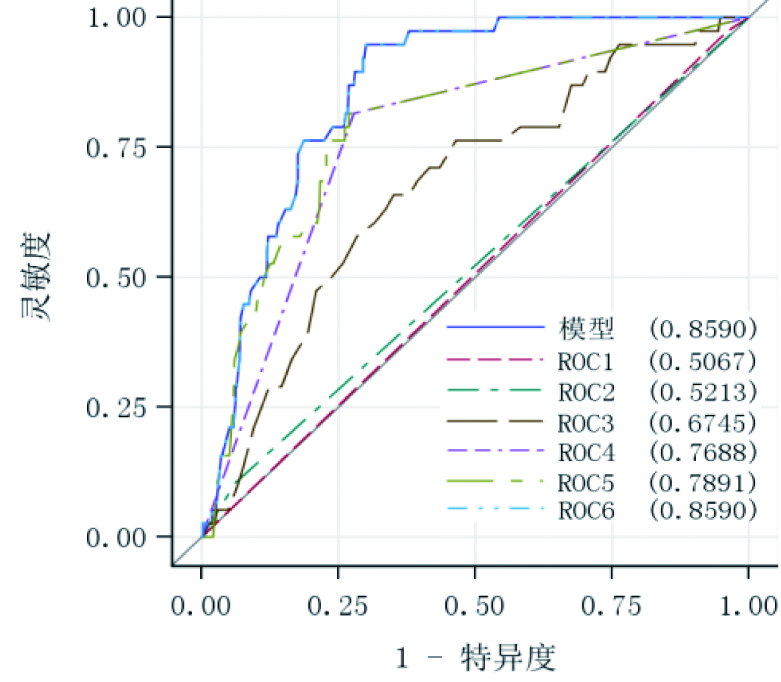 | ROC1:既往有无饮酒史与是否神经介导性晕厥项; ROC2:是否高血压与是否体位性低血压与直立不耐受综合征; ROC3:年龄与年龄项; ROC4:是否心源性晕厥项; ROC5:年龄与是否心源性晕厥项ROC6:五种因素共同参与项 图 2 加入派生变量的ROC曲线图比较 Figure 2 Comparison of ROC curves with derivative variables |