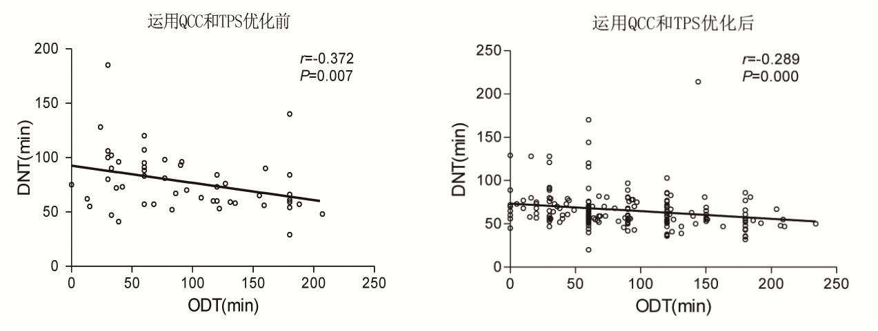 | 图 2 运用QCC和TPS优化前后的DNT与ODT的相关关系图 |