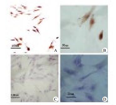 免疫细胞化学染色检测RPMVEC胞质及胞核被染成棕黄色(A:200×; B:400×); 阴性对照胞核及胞质被染成紫蓝色(C:200×; D:400×) 图 1 免疫细胞化学染色法检测RACK1在RPMVEC表达 Figure 1 Immunocytochemistry method to detect RACK1 expression in RPMVECs