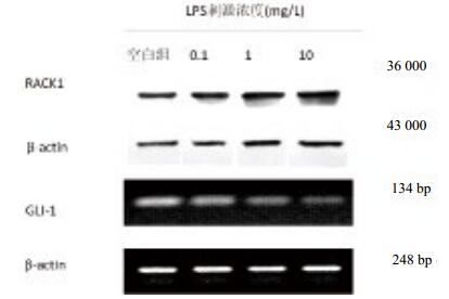 表 1 不同浓度LPS对RPMVEC表达RACK1及GLI-1 mRNA的影响(x±s, n=6) Table 1 Expression of RACK1 and GLI-1mRNA in RPMVECs stimulated by different concentration of LPS(x±s, n=6)