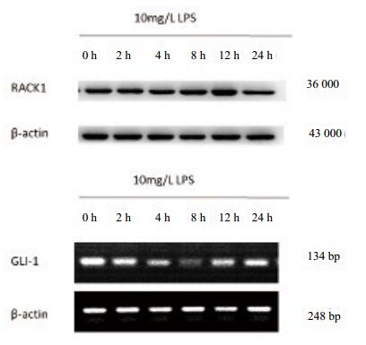 表 2 LPS刺激不同时间诱导RPMVEC表达RACK1及GLI-1 mRNA(x±s, n=6) Table 2 Expression of RACK1 and GLI-1mRNA in RPMVEC stimulated by different lengths of time stimulated by LPS(x±s, n=6)