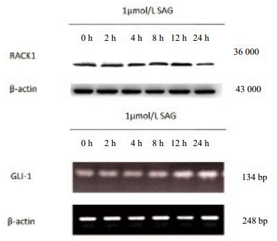 DMEM培养基(美国Hyclone公司),胎牛血清(澳大利亚Gibco公司),RACK1单克隆抗体(ab129084,英国Abcom公司)、辣根过氧化物酶标记的羊抗兔IgG(北京中杉金桥),Smoothened Agonist(SAG,SHH信号通路特异性激动剂,美国Selleck公司),免疫组化试剂盒(北京,中杉金桥),逆转录试剂盒(AT341,北京,全式金公司),梯度基因扩增仪(TProfessional PCR,德国BIOMETRA公司),防脱载玻片; 其余实验试剂均为国产分析纯试剂自行配制,SD大鼠购自安徽医科大学动物实验中心[SPF级,合格证号:SCXK(皖)2011-002]。